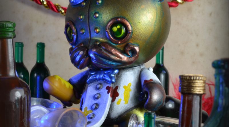 Elwood Barker. Mechtorian customised Mezco Tikimon figure and Rolitoland figure.